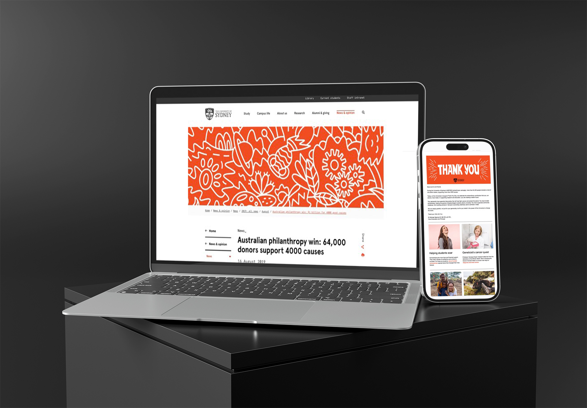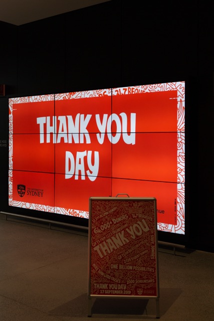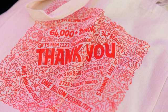 During the University of Sydney’s INSPIRED campaign, more than 64,000 people donated $1 billion. The campaign was the largest philanthropic effort in Australian history. The University celebrated the generosity of their supporters with Thank You Day. Working with an illustrator, the following items were designed for the event: